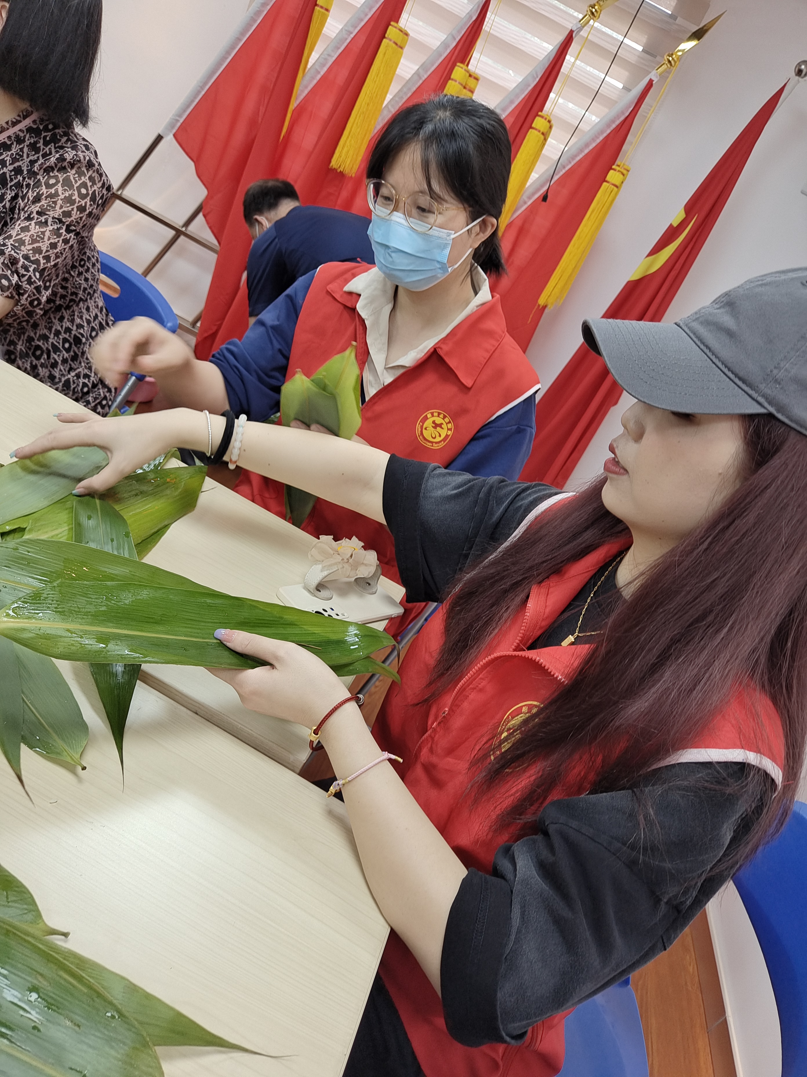 公司组织员工参加东湖社区开展的包粽子活动,活动现场,桌子上摆放着糯米、花生、粽叶等原材料,社区居民们都是包粽子的一把好手,手把手现场教学,在“师傅”的指导下,元拿粽叶、做形状、填糯米、压紧实、封口、用绳子绑好,忙的不亦乐乎,现场充满欢声笑语。最后,大家为展示这丰硕的劳动成果,一起合影留念,互赠粽子传达美好祝愿。