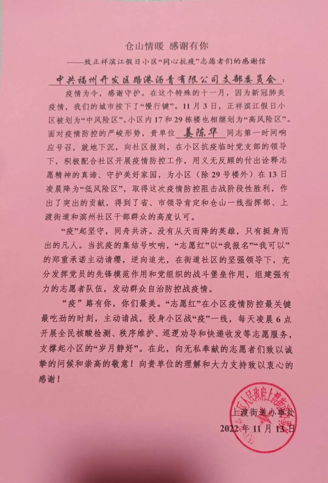 以“疫”为令,向“疫”而行。自福州市疫情爆发以来,路港沥青公司党支部多次组织志愿者奔赴抗疫一线,服从命令,听从指挥,全力协助鼓楼东湖社区、仓山上渡滨州社区、仓山港垱社区等地开展核酸检测等疫情防控工作。近日,路港沥青公司党支部收到一封感谢信,朴实的话语中满溢着对志愿者姜陈华同志不畏艰辛,逆向追光的崇高敬意和衷心感谢。