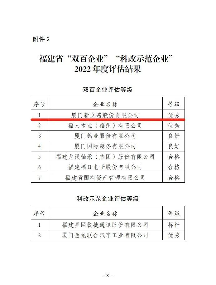 近日,国务院国资委对2022年度地方“双百企业”改革发展工作进行了评估,厦门新立基荣获为2022年度优秀“双百企业”。这是继2021年度获评优秀“双百企业”之后,再次获得此项殊荣。